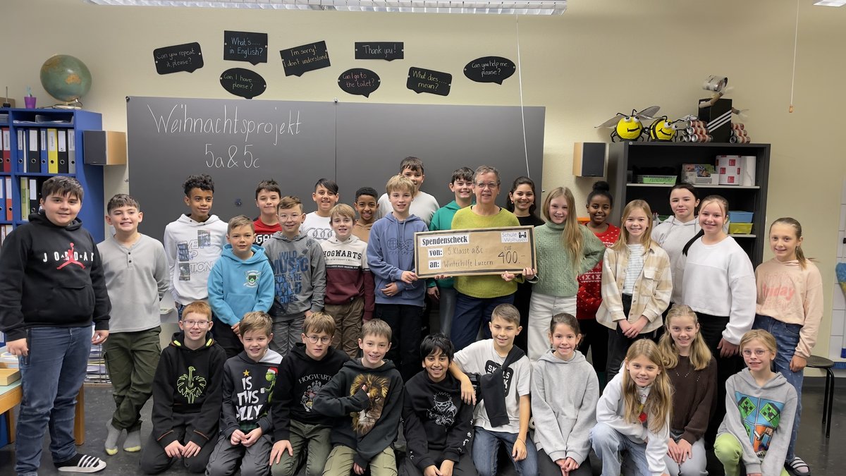 Am 23.12.2023 durfte die Geschäftsleiterin der Winterhilfe Luzern, Fini Seeholzer, in der 5. Klasse von Lehrer Michael Lötscher in Wolhusen überraschend eine Spende von 400 Franken entgegennehmen. Die Kinder hatten Weihnachtskarten gebastelt und diese verkauft - der stolze Erlös von 800 Franken ging zu gleichen Teilen an die Winterhilfe und die Krebshilfe.