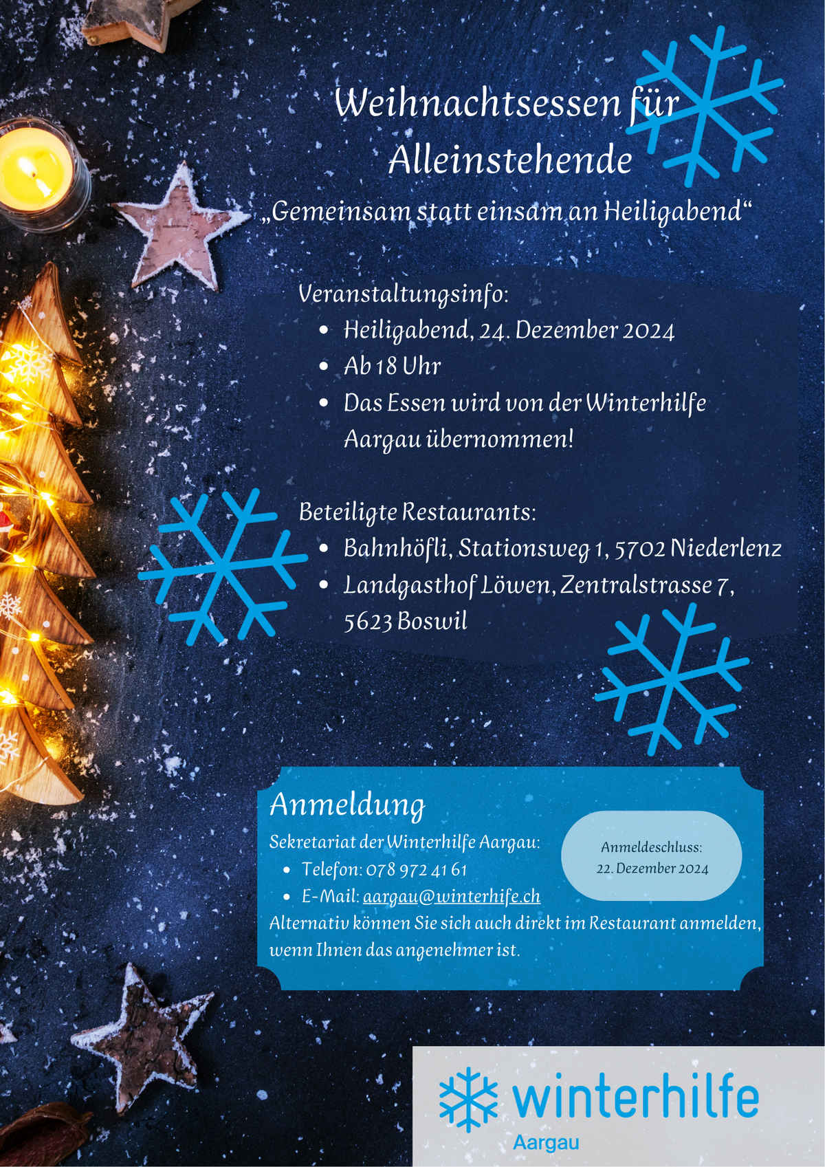 Der Winterhilfe Aargau liegt es besonders am Herzen, alleinstehenden Personen die Möglichkeit zu geben, am Heiligabend einen sorgenfreien Moment zu erleben. Gemeinsam möchten wir einen Abend gestalten, an dem Sorgen und Einsamkeit in den Hintergrund rücken.
